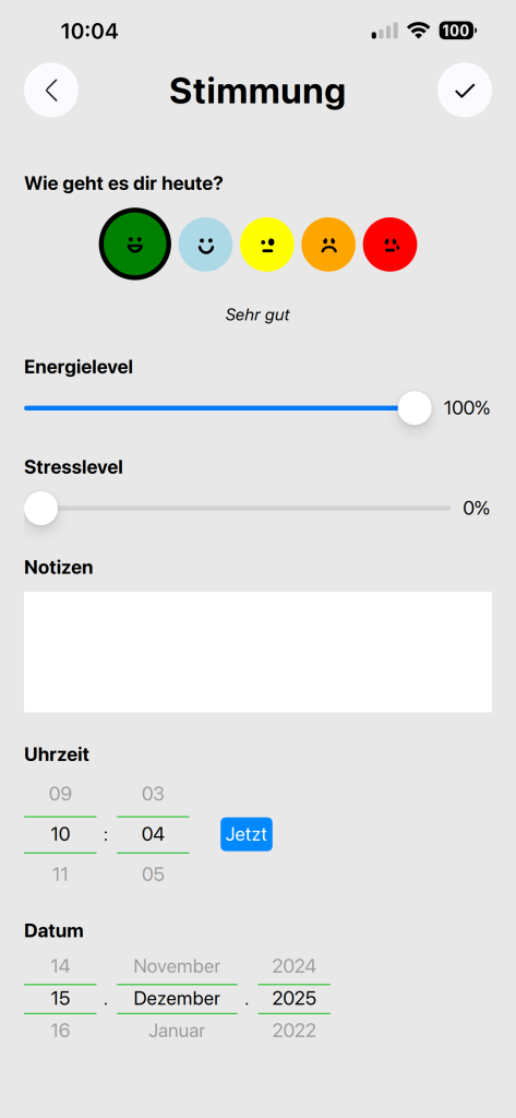 Ich habe mich entschieden, an einer App für neurodivergente Menschen zu arbeiten, um ein Ziel vor Augen zu haben. Herausgekommen ist jetzt eine kleine App, mit der man seine Stimmungen und Reize tracken kann. Das Programm kann noch nicht viel, aber vielleicht interessiert es jemanden.